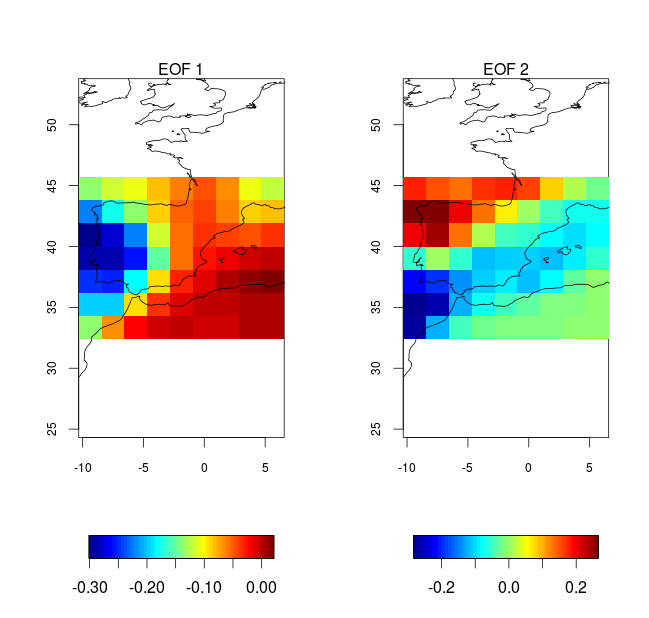 plotEOF(pca.pred, "tp", n.eofs = 2)###Grid from PCs