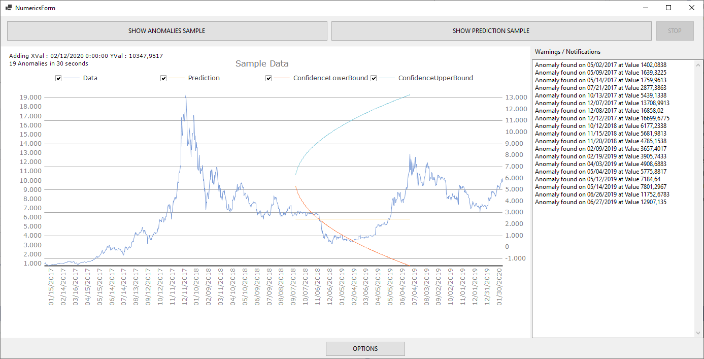 Steema Numerics is a new suite of .NET 5.0 assemblies designed to facilitate the integration of Machine Learning in the analaysis of your data. Core functionality revolves around Anomaly Detection and Data Prediction, and the suite is divided into three assemblies: the engine, which uses Microsoft's ML.NET for its calculations, a ChartHelper designed for use with TeeChart, and a Windows Forms assembly containing Editors for some of the operations.