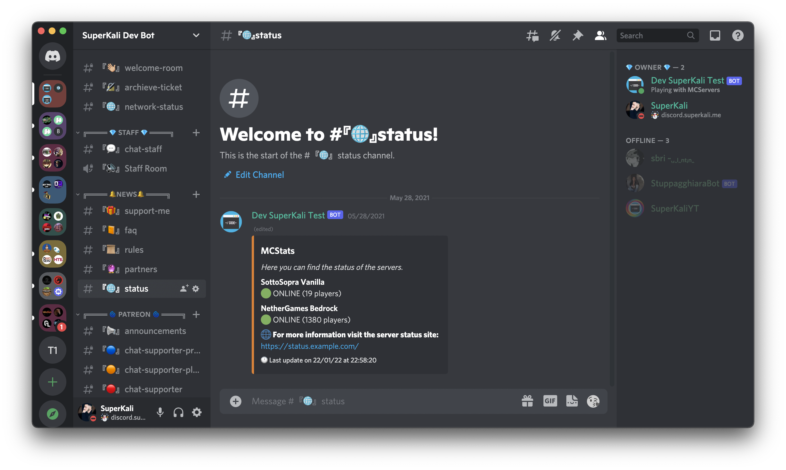 *createstatusmsgon the text channel will be created a message, it will be automatically updated after one minute with the status message.