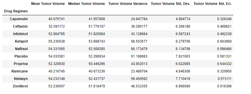 In this study, 249 mice who were identified with SCC tumors received treatment with a range of drug regimens. Over the course of 45 days, tumor development was observed and measured. The purpose of this study was to compare the performance of Pymaceuticals’ drug of interest, Capomulin, against the other treatment regimens.