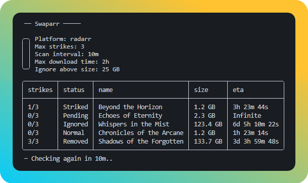 - Strike System: Identified downloads are given a strike, and this evaluation cycle repeats periodically. If a download accumulates the maximum allowed strikes, Swaparr automatically removes it from your instance.