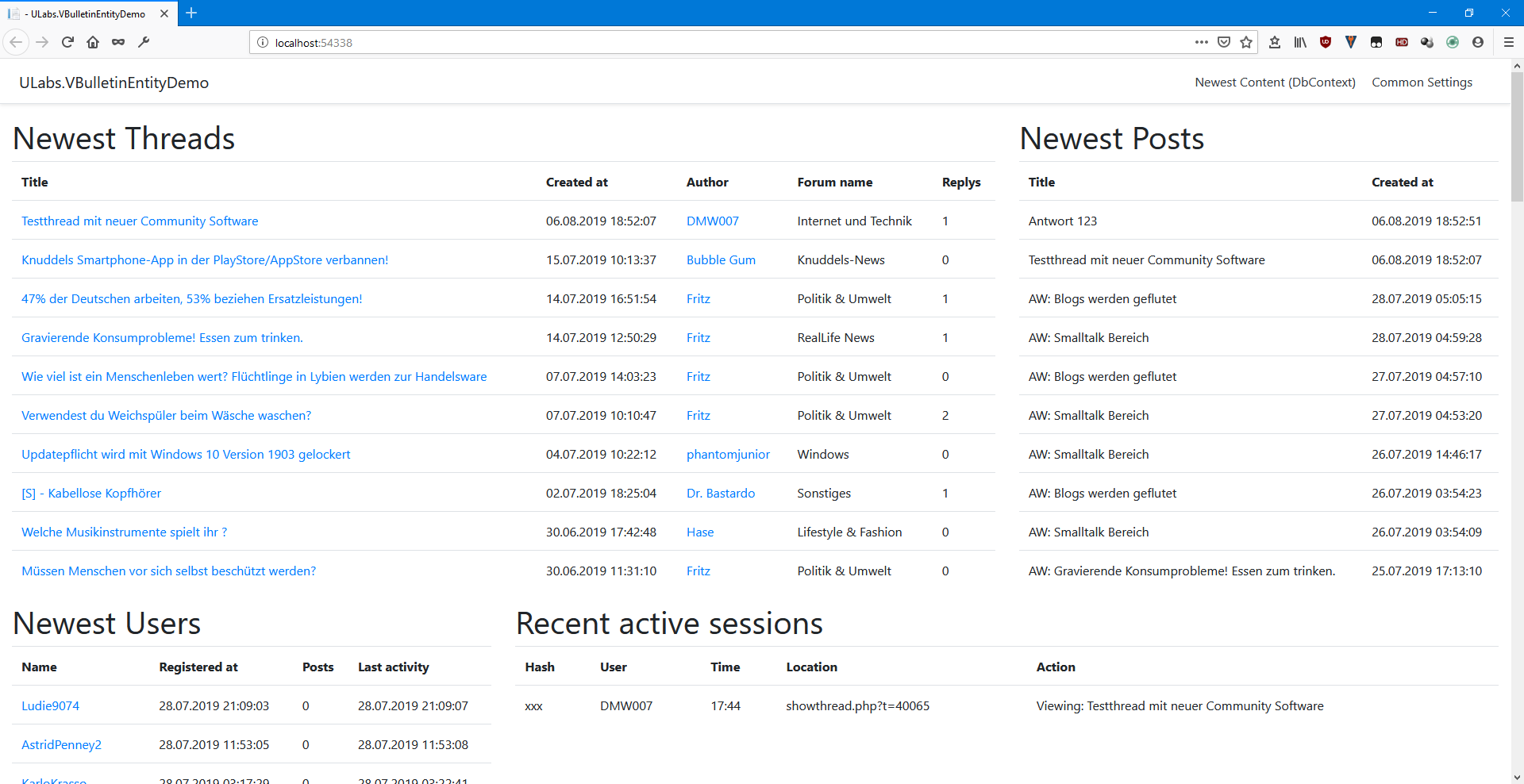 }Now use the instance to write your LINQ queries. See the NewestContentModel.cs model in our example project. It shows how to fetch the newest users, threads, posts and active sessions. Also relations are included, for example the forum of a thread.