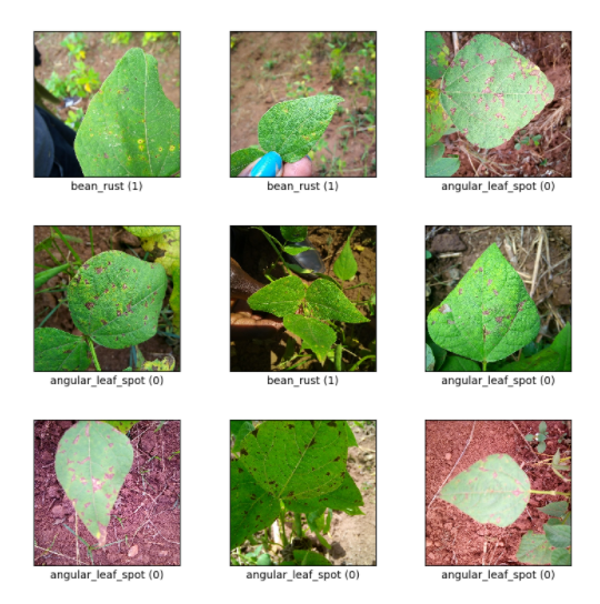 它由3个类组成:2个疾病类和健康类。 疾病包括角状叶斑病和豆锈病。