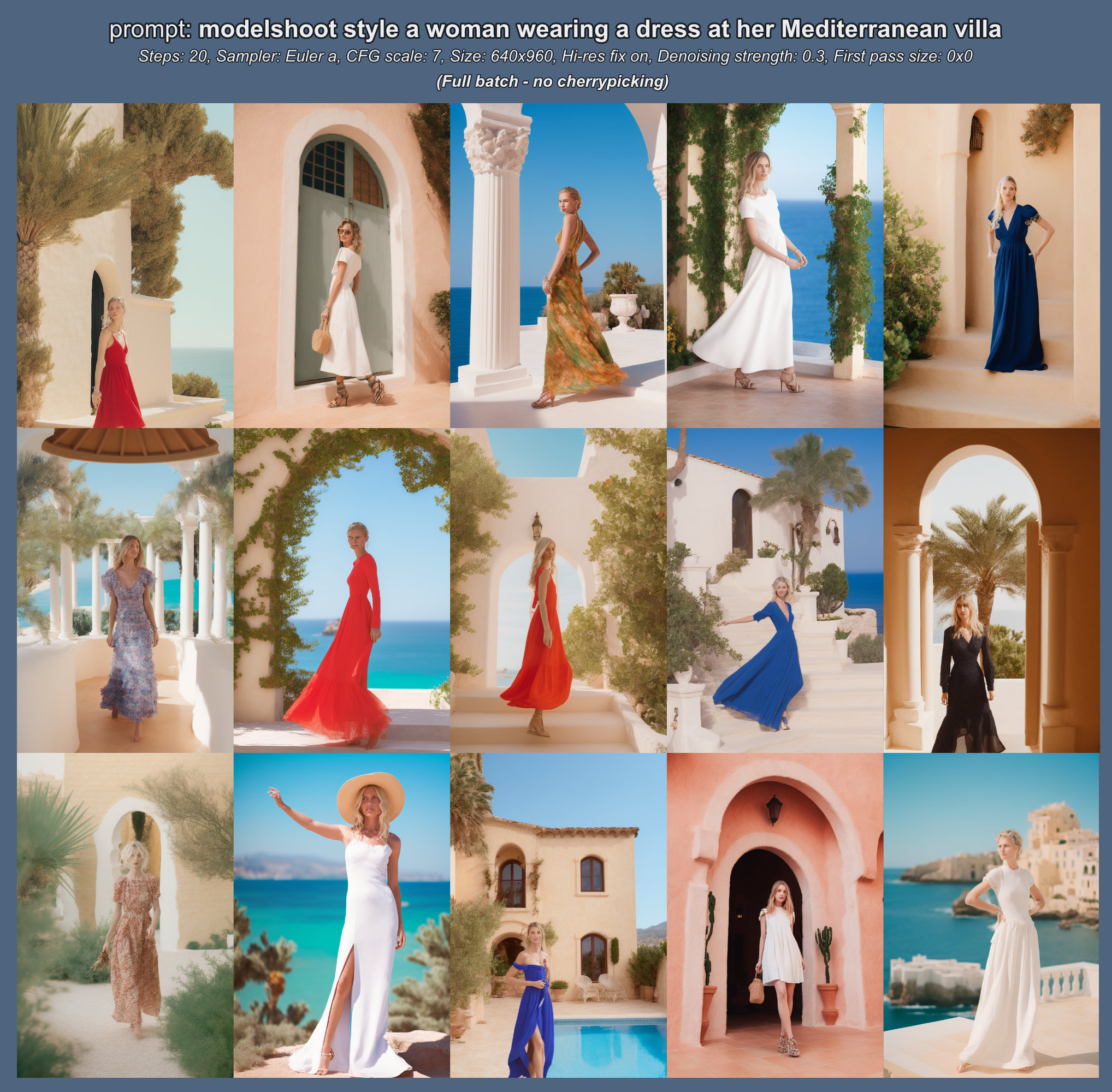 See below a batch example and how the model helps ensure a fashion-shoot composition without any excessive prompting. No face restoration used for any examples on this page, for demonstration purposes.