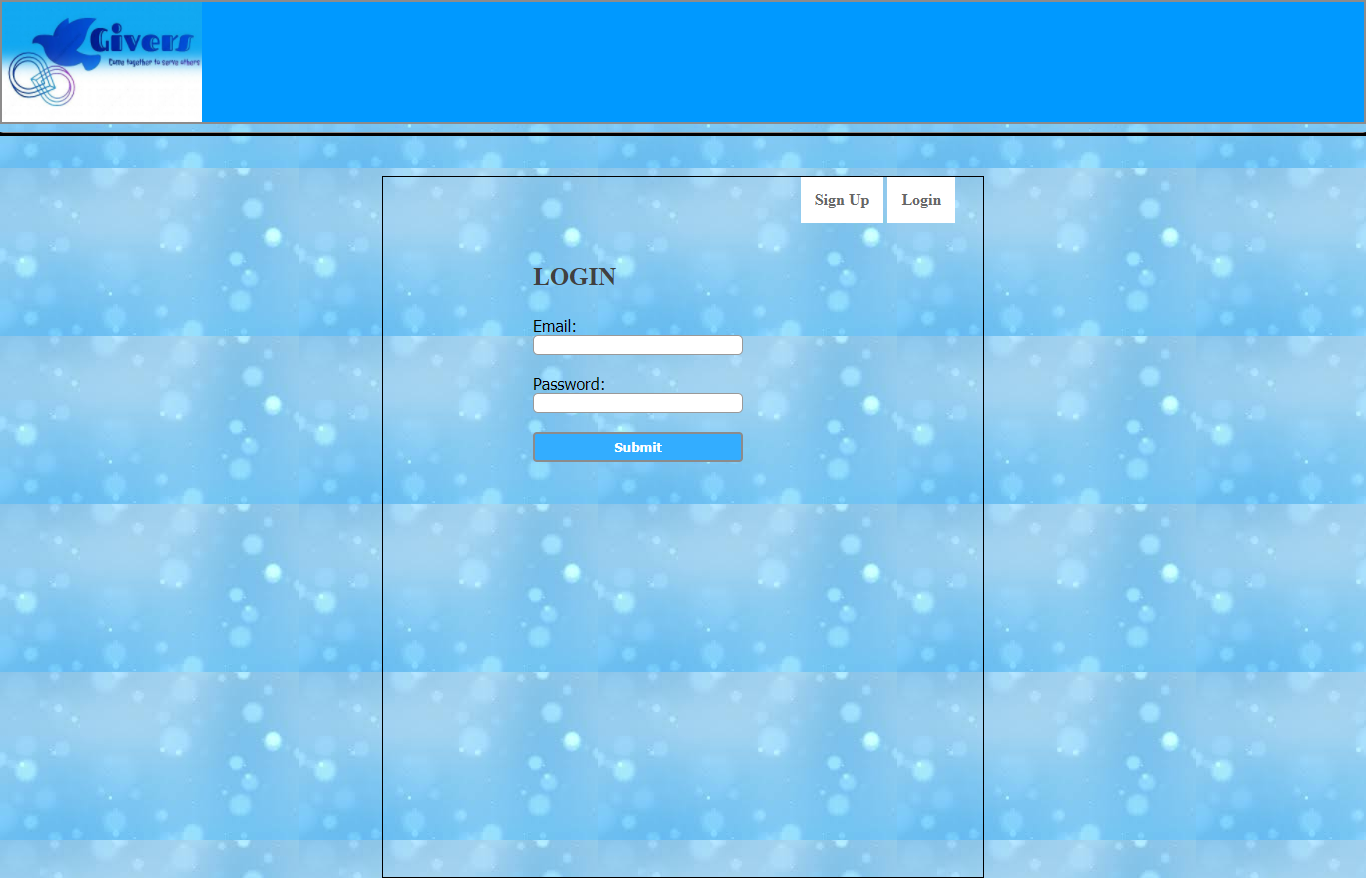 Instructions to use 1.To set this web application,make sure PHP and PHPMyAdmin is installed on your server. 2.Next open PHPMyAdmin and import the givers.sql.This will create the database on your server. 3.Upload all files on your server. 4.Open connect.php file and add the details of PHPMyadmin's id and password to access the database. 5.Open verify.php and on line 34(where the link of activation is provided.Change it according to your localhost address. 5.Once this is done,run it!.