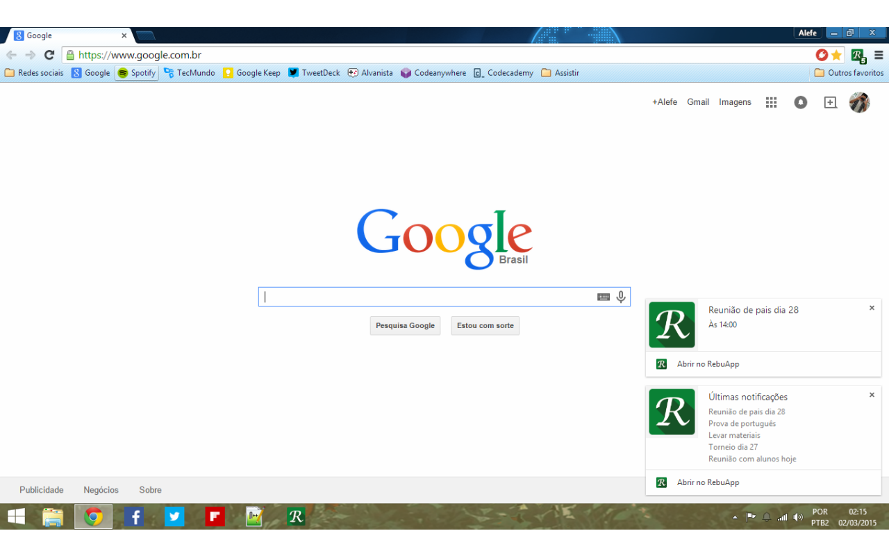 RebuApp was an Android application, web app and Chrome extension designed to display the schedule and agenda for all classrooms, announcements from all clubs and elective courses at my former school, E. E. ProfÂș Willian Rodrigues RebuĂĄ, in CarapicuĂba, SĂŁo Paulo. The app also has school library book search, an integrated dictionary, announcements from the school, prices from the school canteen, annotations and push notifications.
