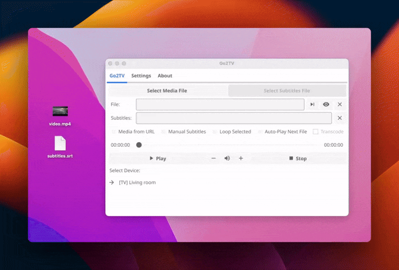 go2tv_vX.Y.Z_macOS_amd64.zip(Intel) orgo2tv_vX.Y.Z_macOS_arm64.zip(Apple Silicon), extract, and run the app - Linux: Download