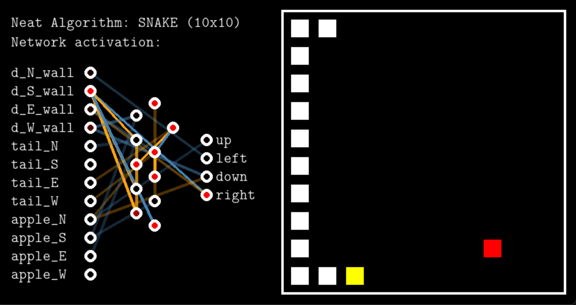 This Python repository contains a testing environment and implementation of the NEAT algorithm for the classic game of Snake.