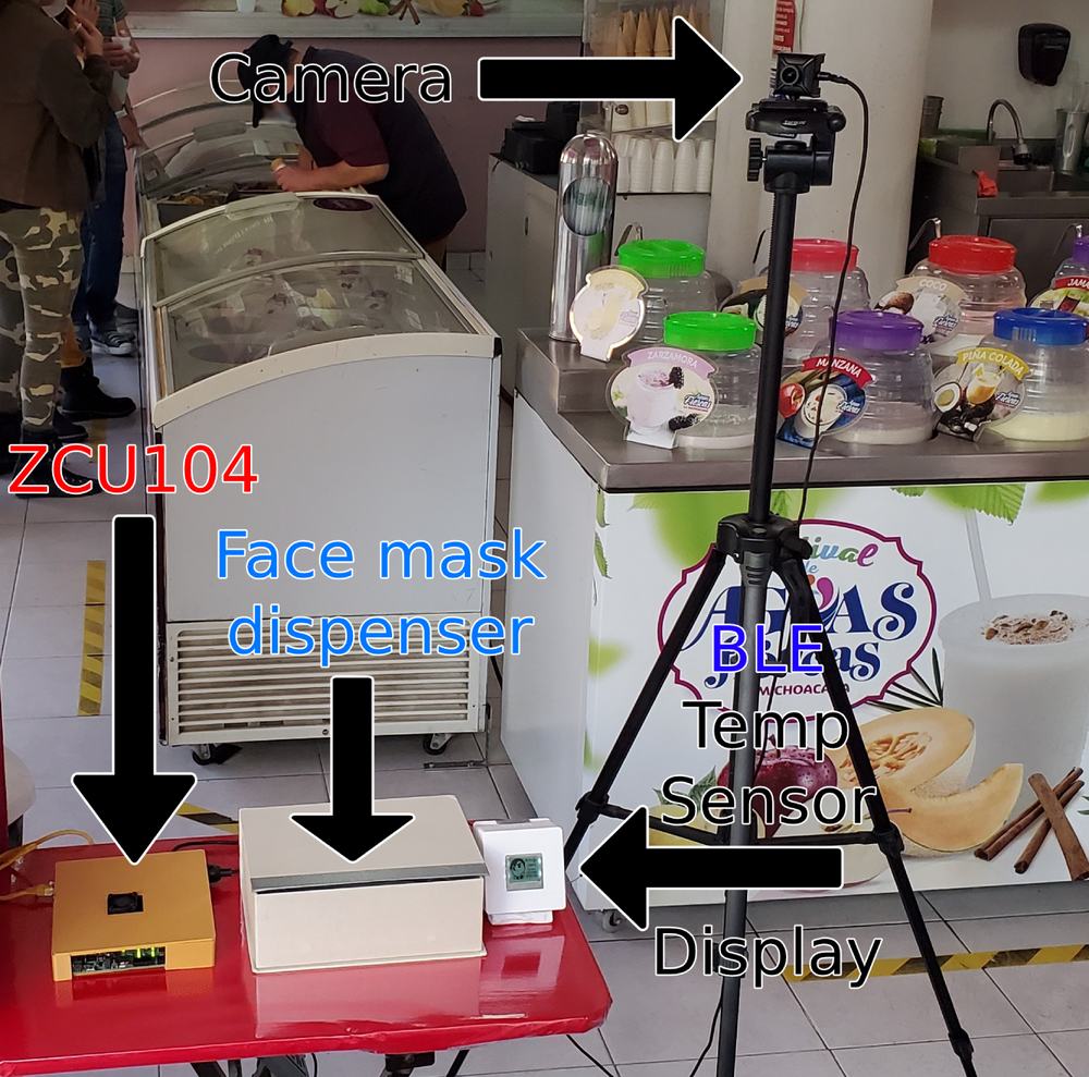 FPGA-based system that monitors facemask use through artificial intelligence, includes a thermometer and facemask dispenser.