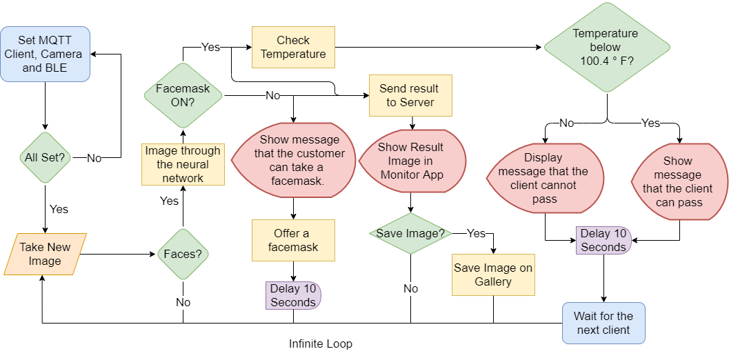 This was perhaps the most important part of the whole project. We have had built a pretty good proof of concept, but technology exists to be used and businesses have been hit the hardest by COVID-19, specially the small and medium ones. So , first and foremost we attempted to find a business nearby that operates and has to have its clients wearing a mask (and that will allow us to test the PoC). What came to mind first were restaurants, 7 eleven-ish stores and supermarkets. As naive as we were, we went first to several supermarkets to just try and se if they would allow us to test the PoC and record its functionality. Of course, we were soundly rejected. Later we tried with an Ice-cream store after several attempts with supermarkets and 7elevens. And they finally allowed us to test it and record some results that you can see in our demo video!