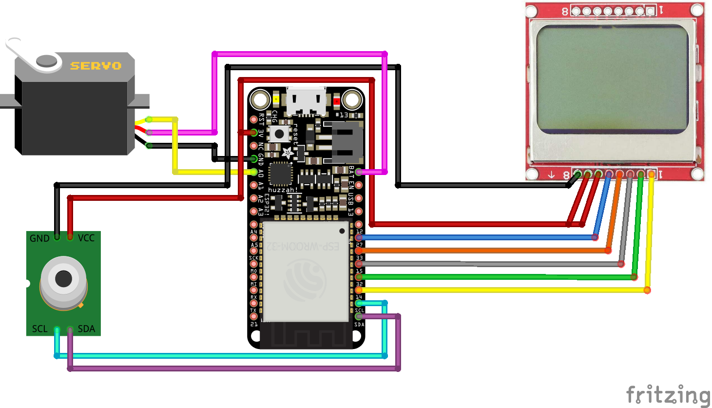 To measure the useer's temperature and the Facemask dispenser, we created the following circuit with an ESP32.
