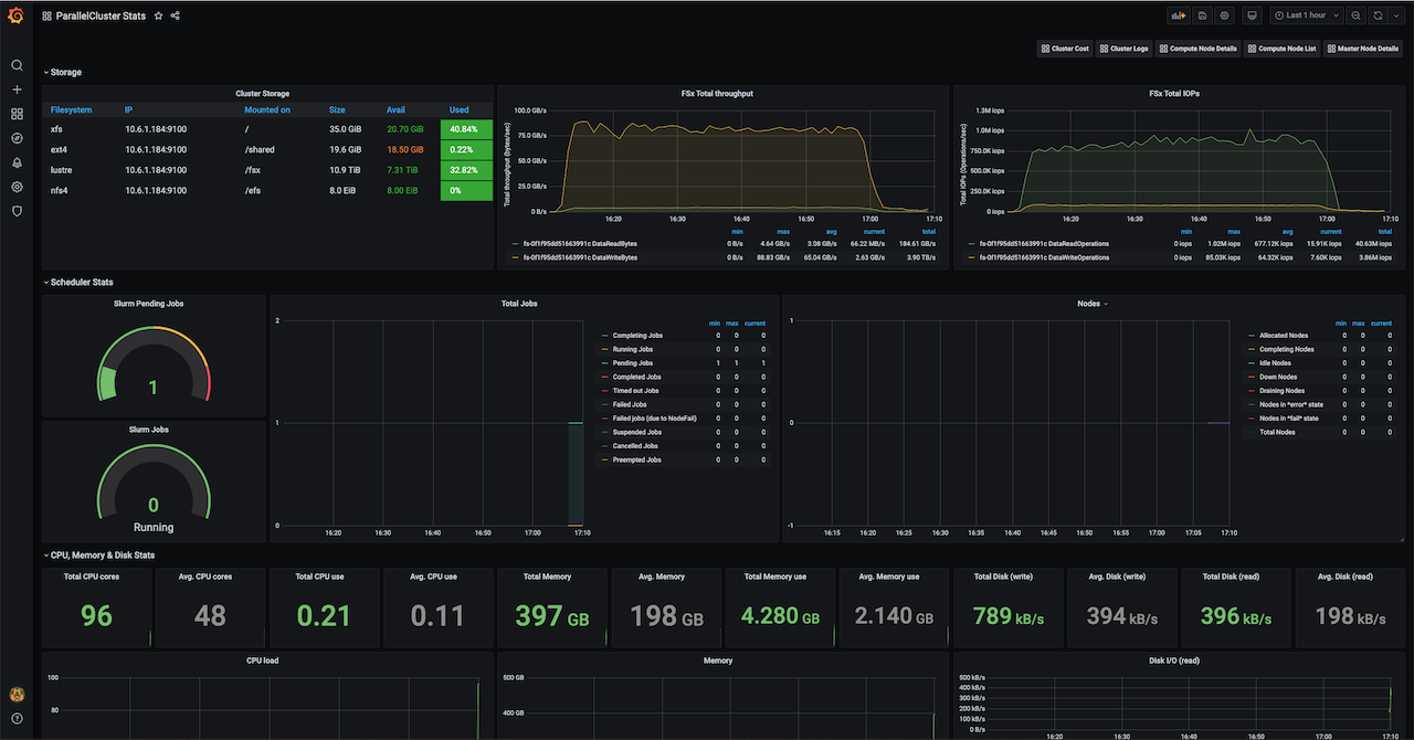 - ParallelCluster Summary - this is the main dashboard that shows general monitoring info and metrics for the whole cluster. It includes Slurm metrics and Storage performance metrics.