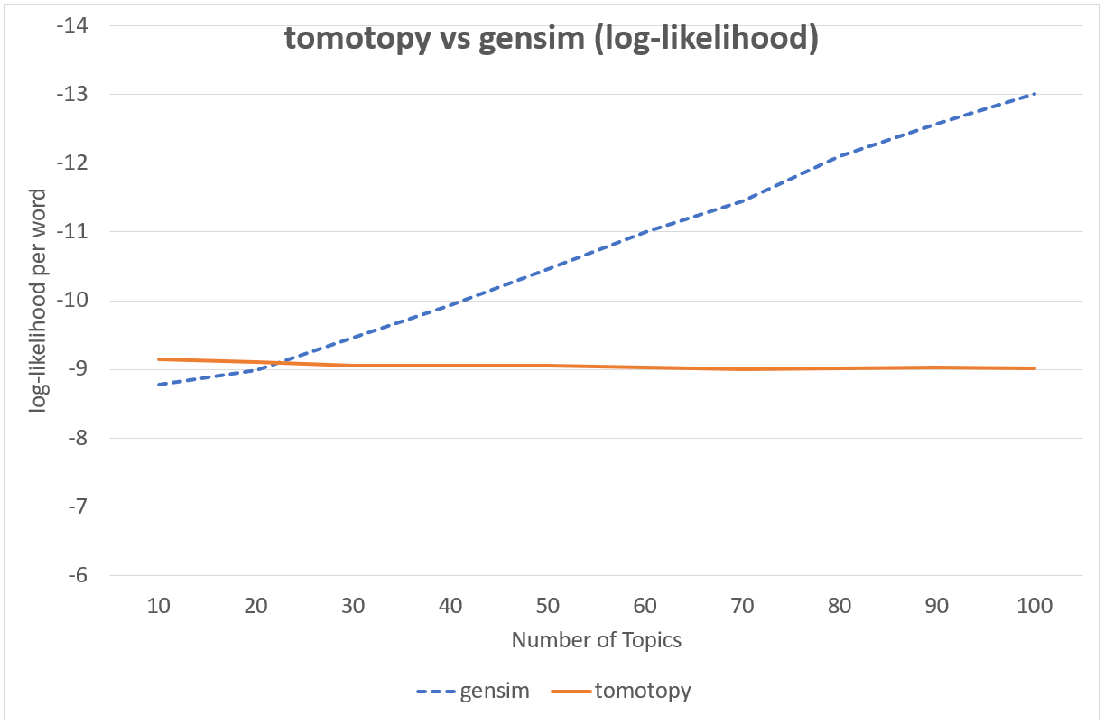 Following chart shows the comparison of LDA model's running time between tomotopy and gensim. The input data consists of 1000 random documents from English Wikipedia with 1,506,966 words (about 10.1 MB). tomotopy trains 200 iterations and gensim trains 10 iterations.