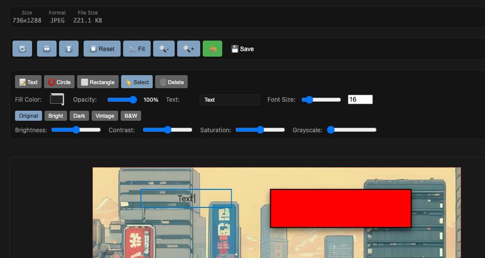 - Image Filters: Brightness, contrast, saturation, grayscale adjustments