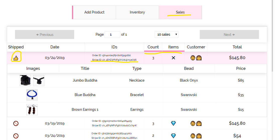 • Sales data sorted by the number of items per order. Provides a toggle button for shipped status and a link to the order on Stripe. Sub-table containing list of ordered items is open.