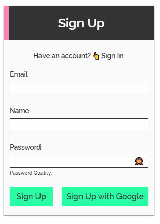 • Password input component which displays the quality of the password as it is typed. Using regular expressions and a scoring algorithm to calculate props sent to a styled component.