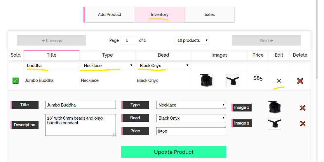 • Inventory data filtered by products containing the test "buddha" with a product type of "Necklace" and a bead type of "Black Onyx". The optional update product sub-table is open where any product information or image can be changed by the admin.