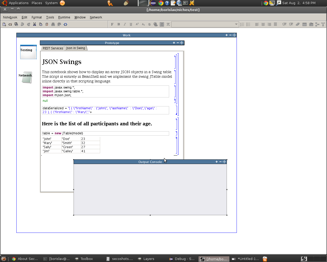With Seco you write notebooks which are structured files mixing code, documentation and output. The concept comes from the Mathematica system. You can mix different programming languages integrated in a single runtime. You can create GUI interfaces for various tasks and organize them in zoomable, nested containers. The input of any computation is an evaluatable cell in some scripting language. The output of any computation is also cell that can contain any type of Java object and that can also be moved and attached to any other piece of the environment. The connection between input and output is preserved. You can share your work at the individual cell level with others in real-time through a P2P network, or by exporting whole notebooks to files.