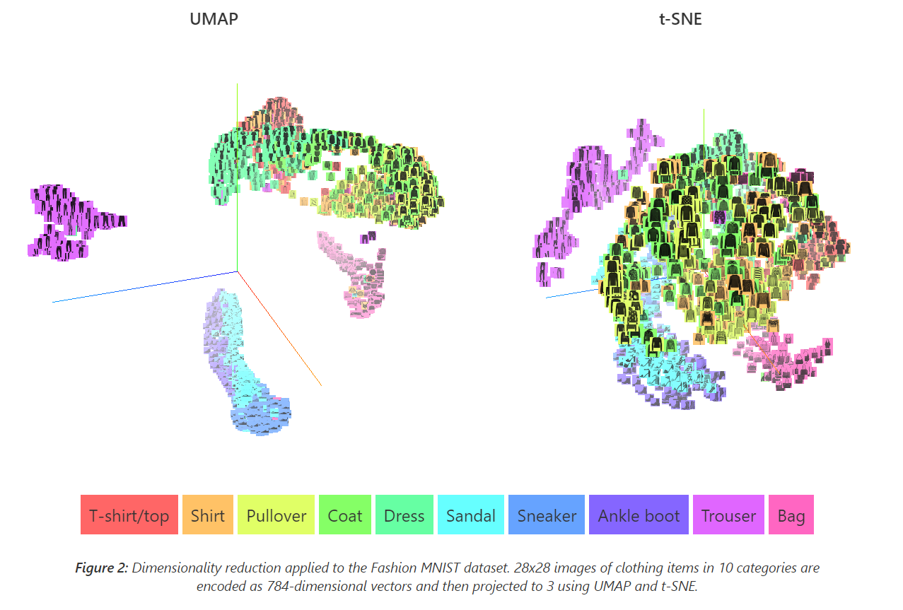 Below is an example of the clustering between UMAP and tSNE, and shows how UMAP is better than tSNE in preserving global structure. While each category in both UMAP and T-SNE is clearly clustered accordingly indicated by the individual colours, similar categories are grouped closer together in UMAP than in T-SNE, thereby preserving the global structure for UMAP.