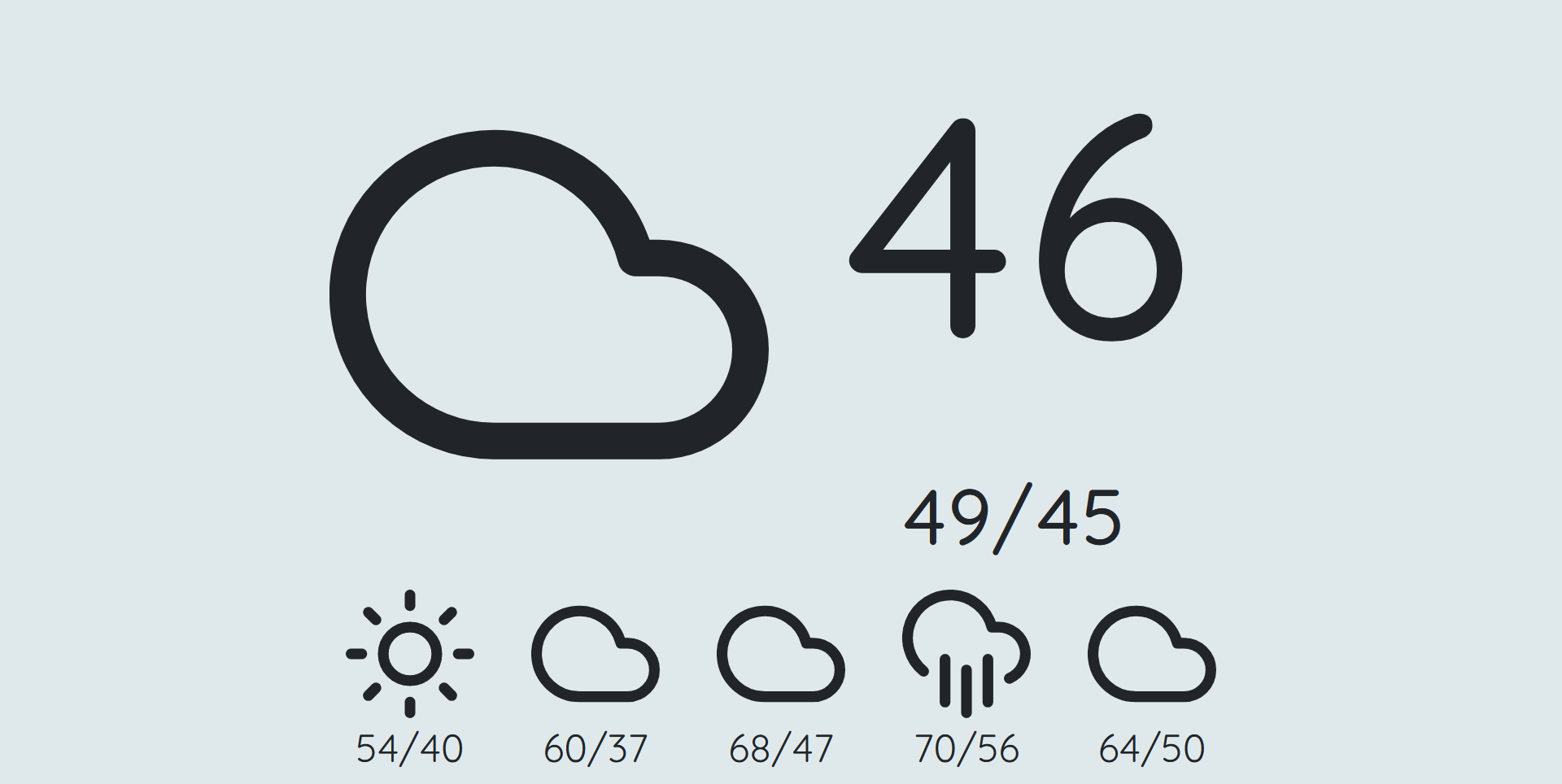 Minimalistic weather dashboard to provide today's weather, temperature, high, low, as well as a 5-day forecast.