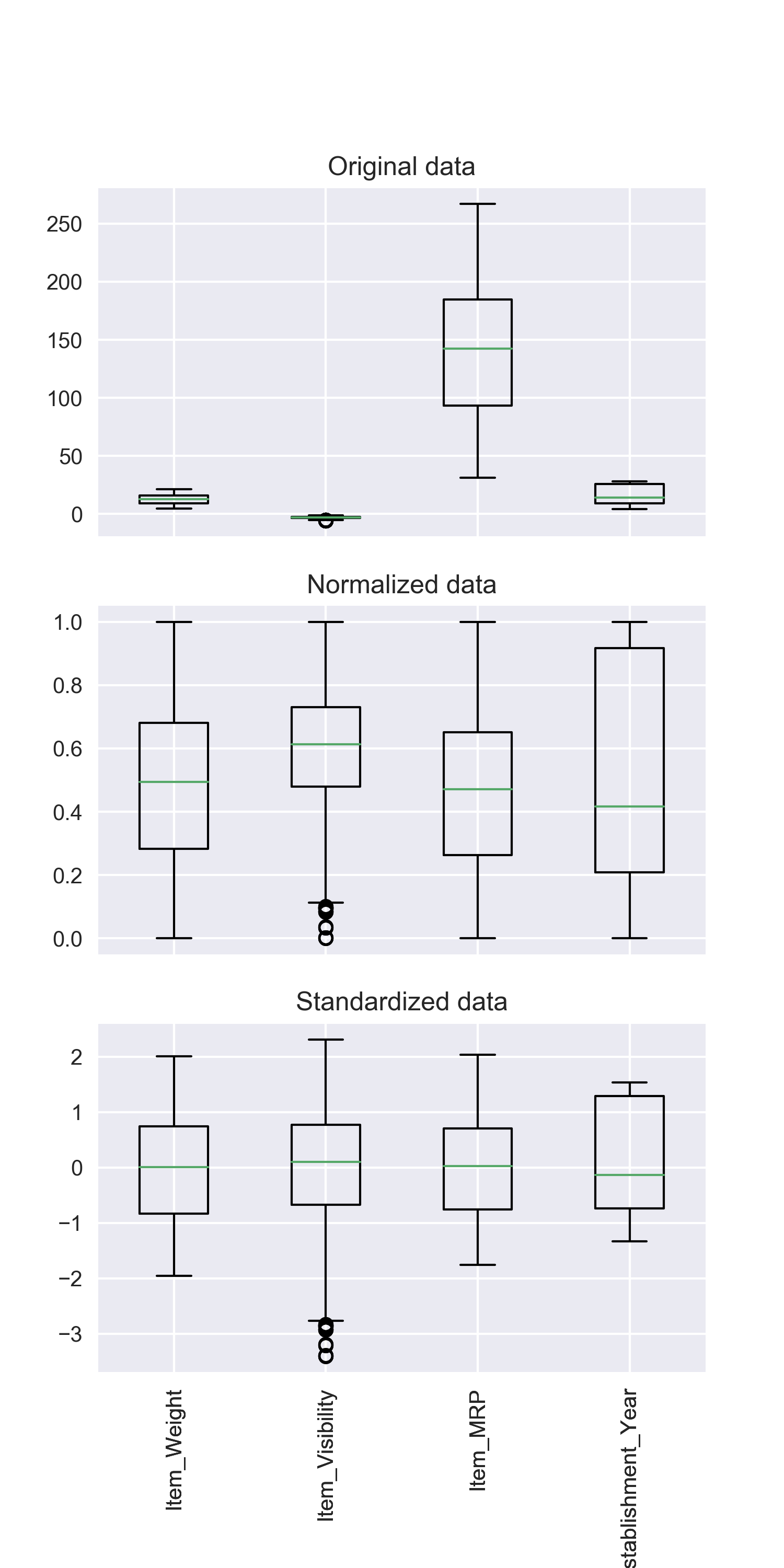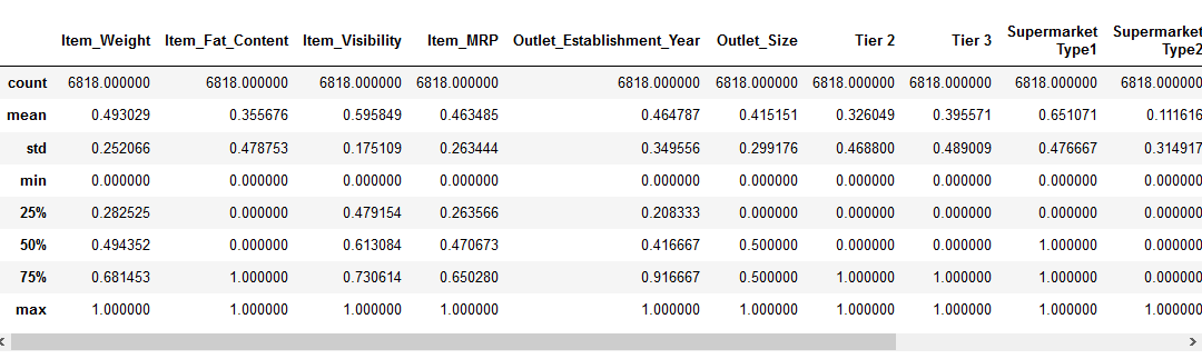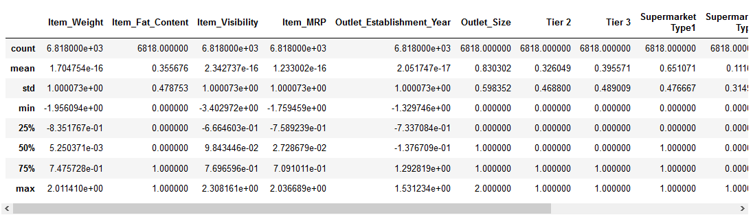 We can see that there is a huge difference in the range of values present in our numerical features: Item_Visibility, Item_Weight, Item_MRP, and Outlet_Establishment_Year. Let’s try and fix that using feature scaling!