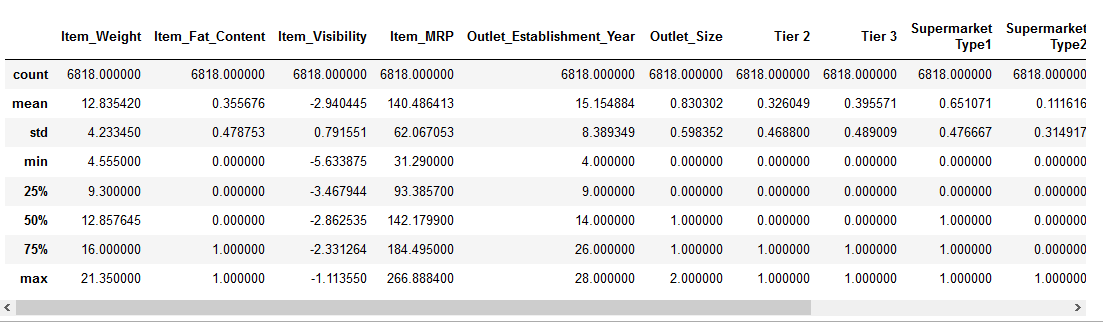 Note: You will notice negative values in the Item_Visibility feature because I have taken log-transformation to deal with the skewness in the feature.
