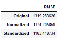 df_dt = pd.DataFrame({'RMSE':rmse},index=['Original','Normalized','Standardized'])