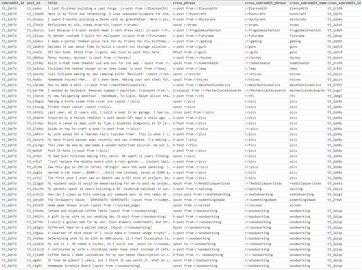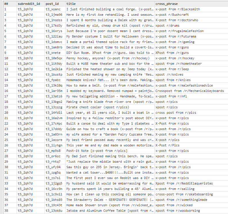 Figure 1: Truncated list of parsing results from the subreddit /r/DIY