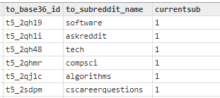 This code was run on /r/aww, /r/DIY, /r/AskComputerScience, /r/dataisbeautiful, and /r/catpictures. The following are some relevant results. Although (as outlined in the above) there were additional outputs generated along the steps, these are the ones that are the most useful from a data analysis view point. This data really shows how the type of subreddit affects content, and it begins to show how the subreddits relate to each other as they share content.