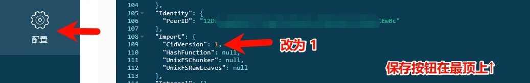 在配置中的 Import 部分把 CidVersion 参数改为 1 ,然后保存并重启 IPFS 即可。