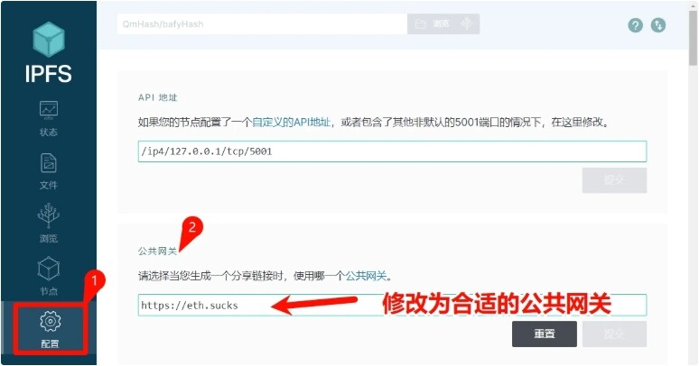 由于默认的公共网关被墙了,在分享前需要修改 IPFS 的公共网关,可以参考此页面并修改为可用网关中的一个: