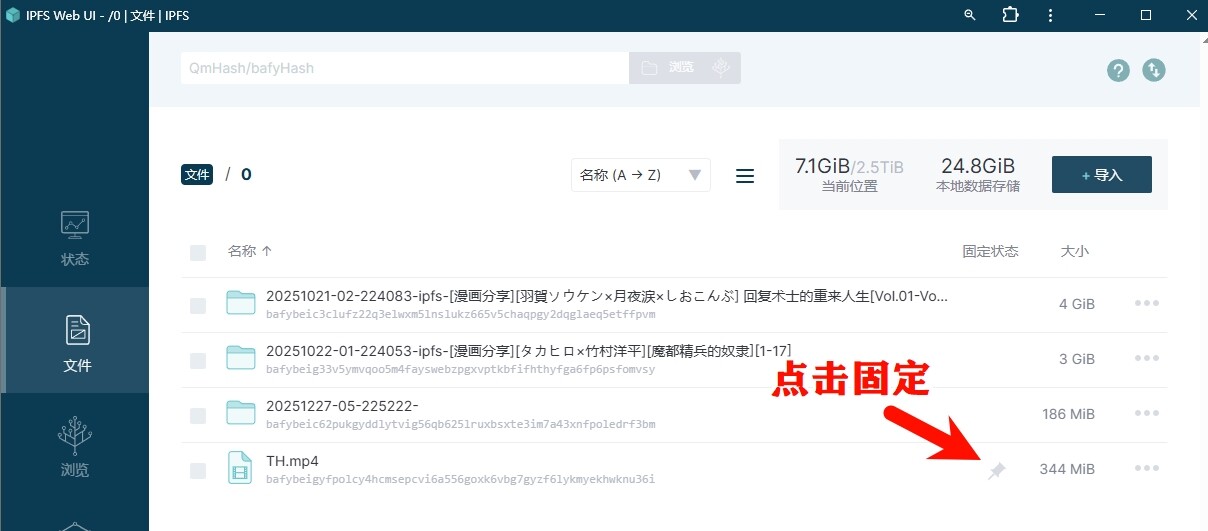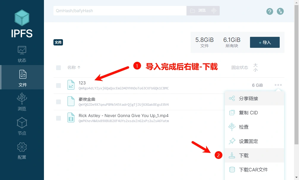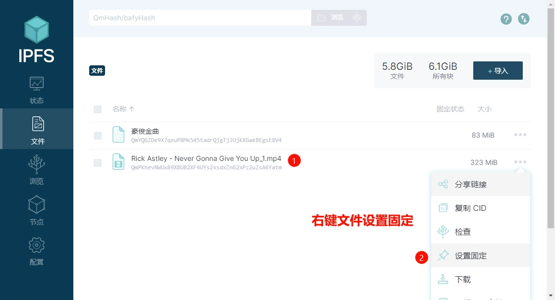 在下载前建议先设置固定,只要固定完成了,文件就一定可以保存到本地,以避免直接下载过程中出现错误。(固定一个来自 IPFS 路径的 CID 可能会需要一定时间,因为要从其他节点拉取文件)