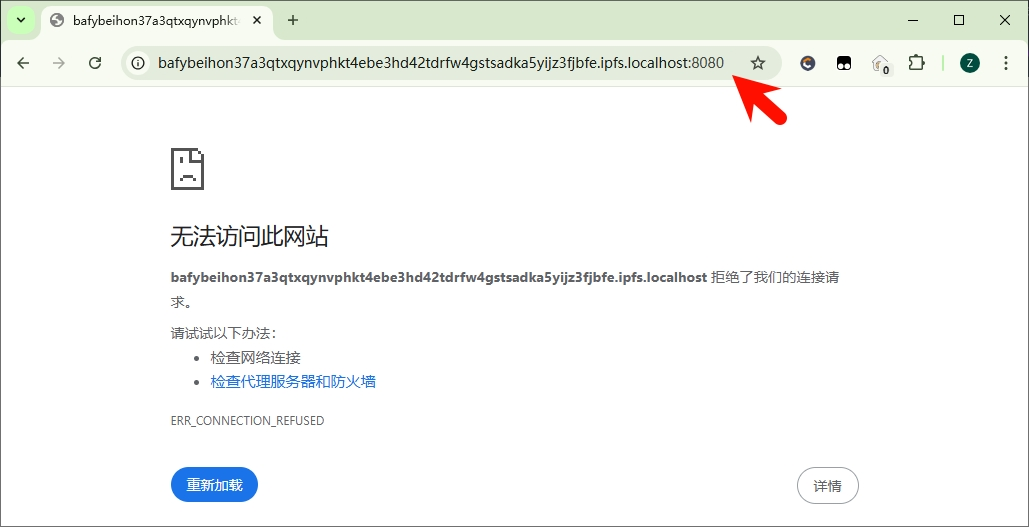 .ipfs.localhost:8080 中最后 4 位数字为本地网关的端口号,通常为 8080,但是有时候也可能变化,此时端口被占用就无法使用,常见原因比如酸奶网盘与 IPFS 客户端冲突等,如果发现本地网关无法使用,如下图所示: