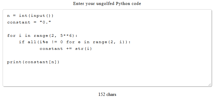 Your input is converted by the golfcode function in the script.js file. In fact, every pair of two adjacent chars in your input code is jammed together to make only 1 char, resulting in a golfed code length of x/2+25, given that x is the length of your input code.