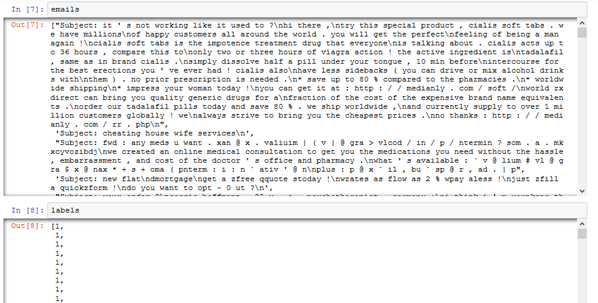 Figure: 1.1.1 – emails and label data Tools letters_only and clean_text are created to clean the email data extracted from enron directory. WordNetLemmatizer tool and CountVectorizer are initialized.