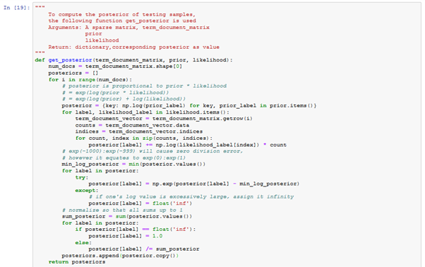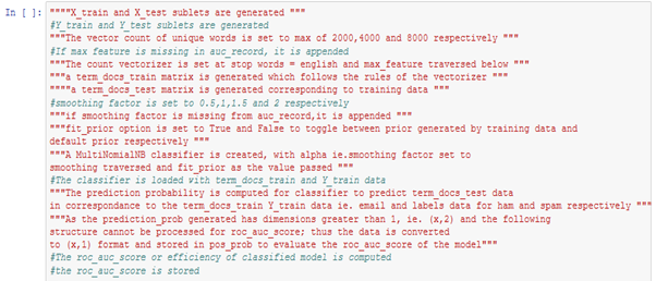 The Bayesian classifier is loaded with the training data to set the prediction probability for the classifier. The sample test matrix, term_docs_test is set as parameter and a prediction list is generated to predict the class of email read by the classifier. Result