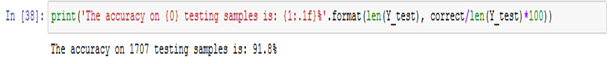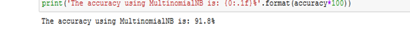Figure: 3.1.2 – accuracy percentage MNNB A report is generated for the metric scores of classifier, with the support column which shows the number of positive samples in the respective classes 0 and 1.