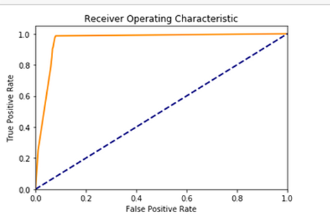 The roc_auc_score is generated for classifier model = 0.9652.. or 96%, therefore the efficiency of model has been proved to be very high.