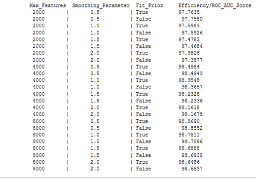 The efficiency of the model deployed at variable max features, smoothing parameters and fit prior have been computed, recorded and displayed successfully. The results obtained clearly outlines that the Naive Bayesian model is more efficient than the memory based model, and can store and detect words in the range of 2000 and above correctly, hence proving the high efficient nature of the Bayesian classifier as stated by Sahami in his research.