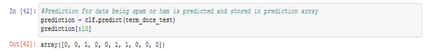 Figure: 6.1.2 – prediction array The prediction array returns 1 for spam and 0 for not spam. The following prediction array generated for term_docs_test in correspondence to the true nature of the test emails is correct to an extent. Hence, the Bayesian classifier is validated and verified for its authenticity and its prediction capacity on a random test data, loaded onto the classifier.