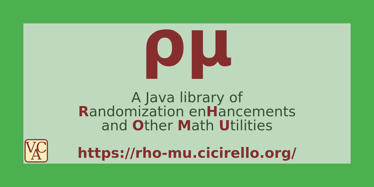 Cicirello, V. A., (2022). ρμ: A Java library of randomization enhancements and other math utilities. Journal of Open Source Software, 7(76), 4663, https://doi.org/10.21105/joss.04663.