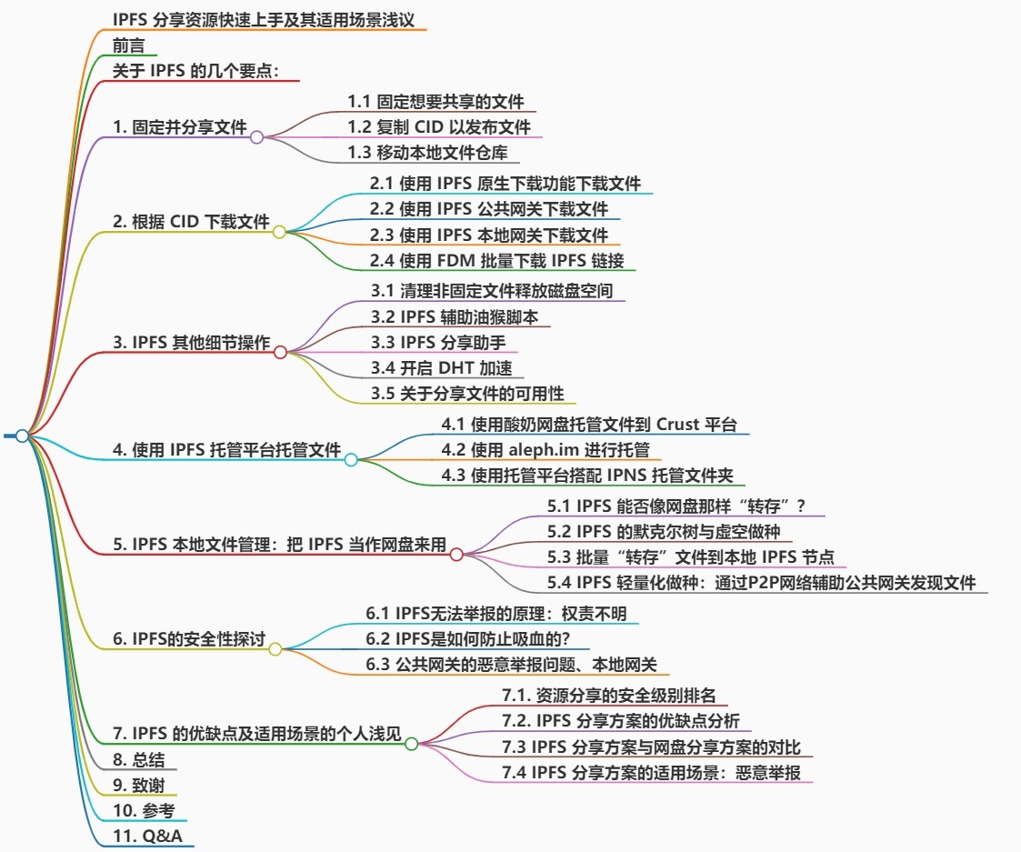 1、2、3 节主要讲解 IPFS 的基本使用方法; 4 节讲如何使用托管平台托管文件; 5 节讲使用 IPFS 轻量化做种; 6 、7 节讨论了 IPFS 安全性方面的问题。