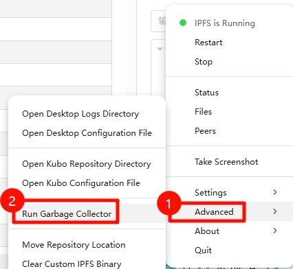 当 IPFS 的本地文件过多,可以选择任务栏图标中的 Run Garbage Collector 进行清理,这个操作会清理所有没有在文件选项卡中显示的文件释放磁盘空间。