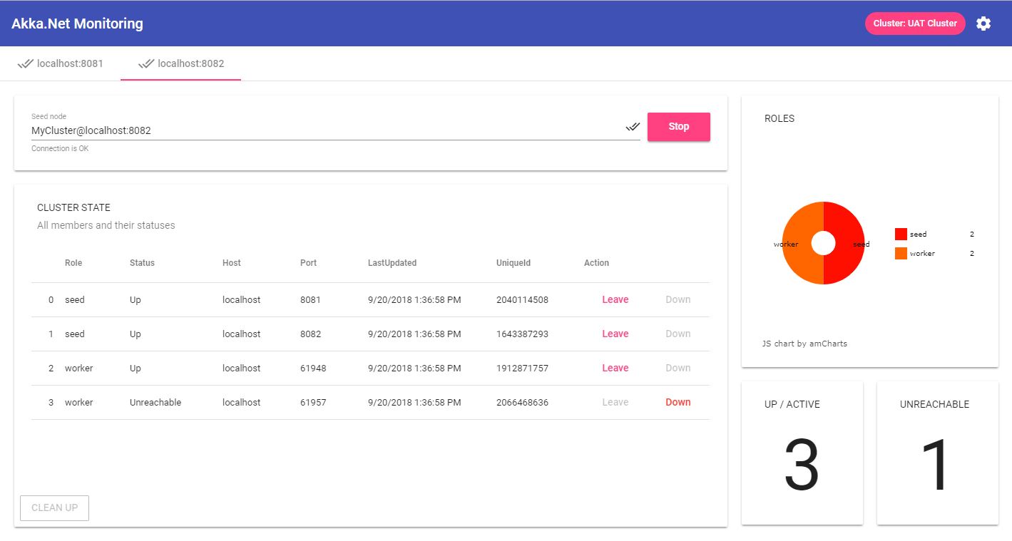 This project aims to provide a simple way to visualize Akka.NET cluster and allow cluster admin to control cluster "leave/down" of each nodes.