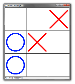 - Først køres klassen "TicTacToeServer", så en server bliver etableret lokalt.