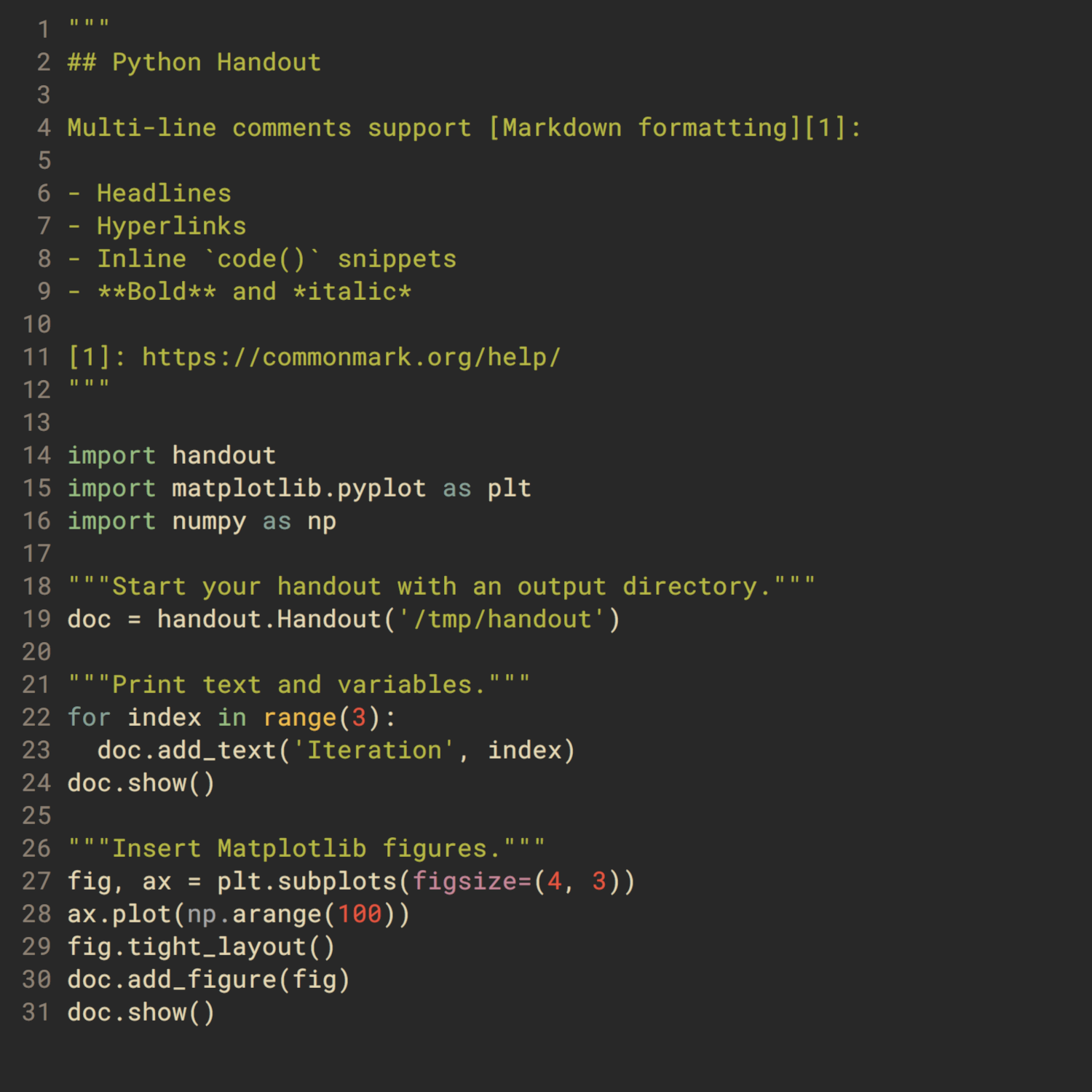 Turn Python scripts into handouts with Markdown comments and inline figures. An alternative to Jupyter notebooks without hidden state that supports any text editor.