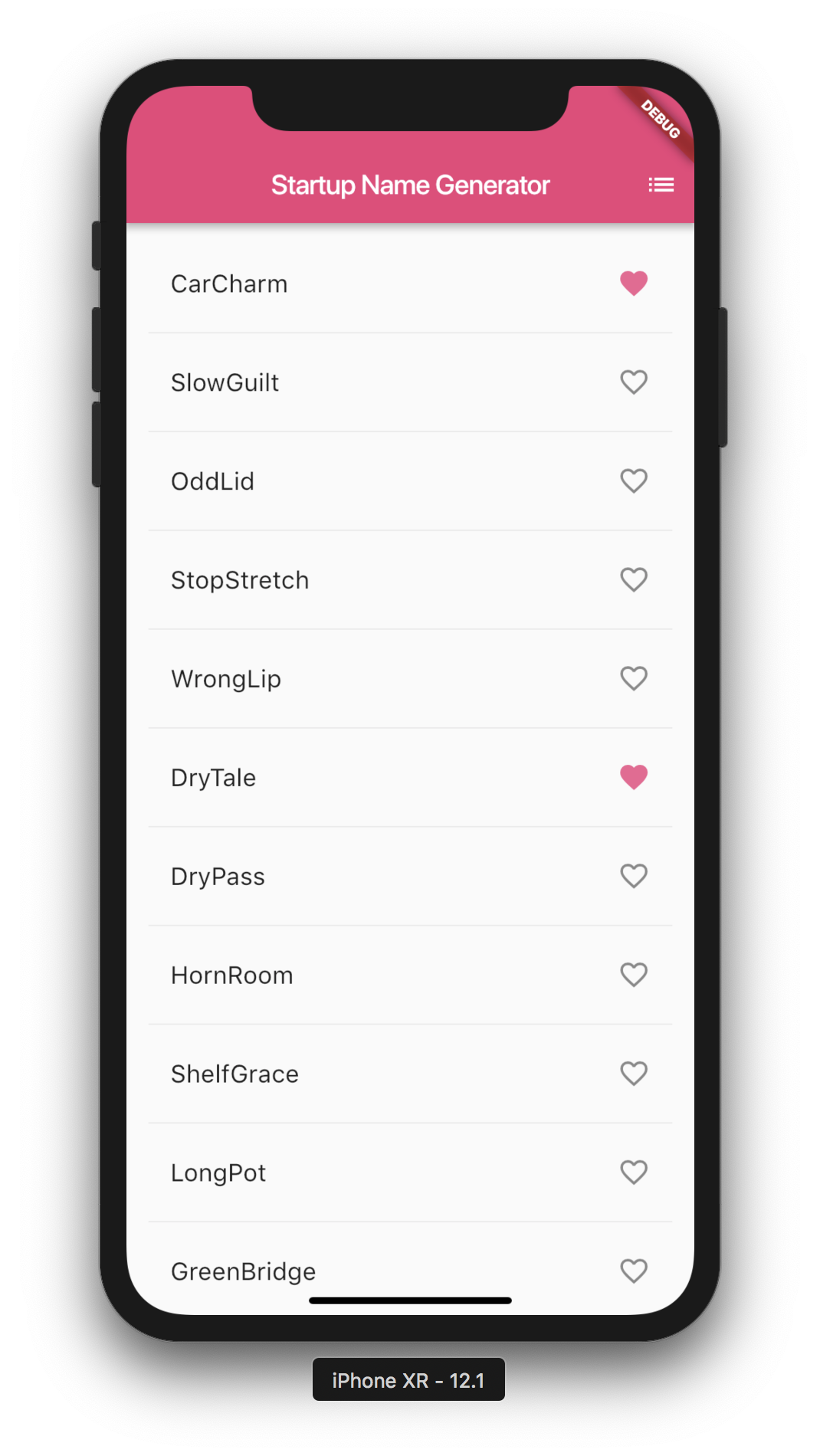 flutter-startup-name-generator Generate startup names using this app. Made in Flutter. Getting Started Followed Google CodeLabs Part 1 & Part 2 to make this project. Then I added SharedPreferences to it to persist data. Screenshots