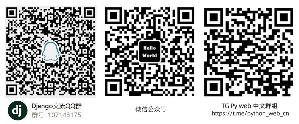 一个人的学习是孤单的。欢迎扫码 Django 交流QQ群(107143175)、博主公众号、TG群组,和大家一起进步吧!