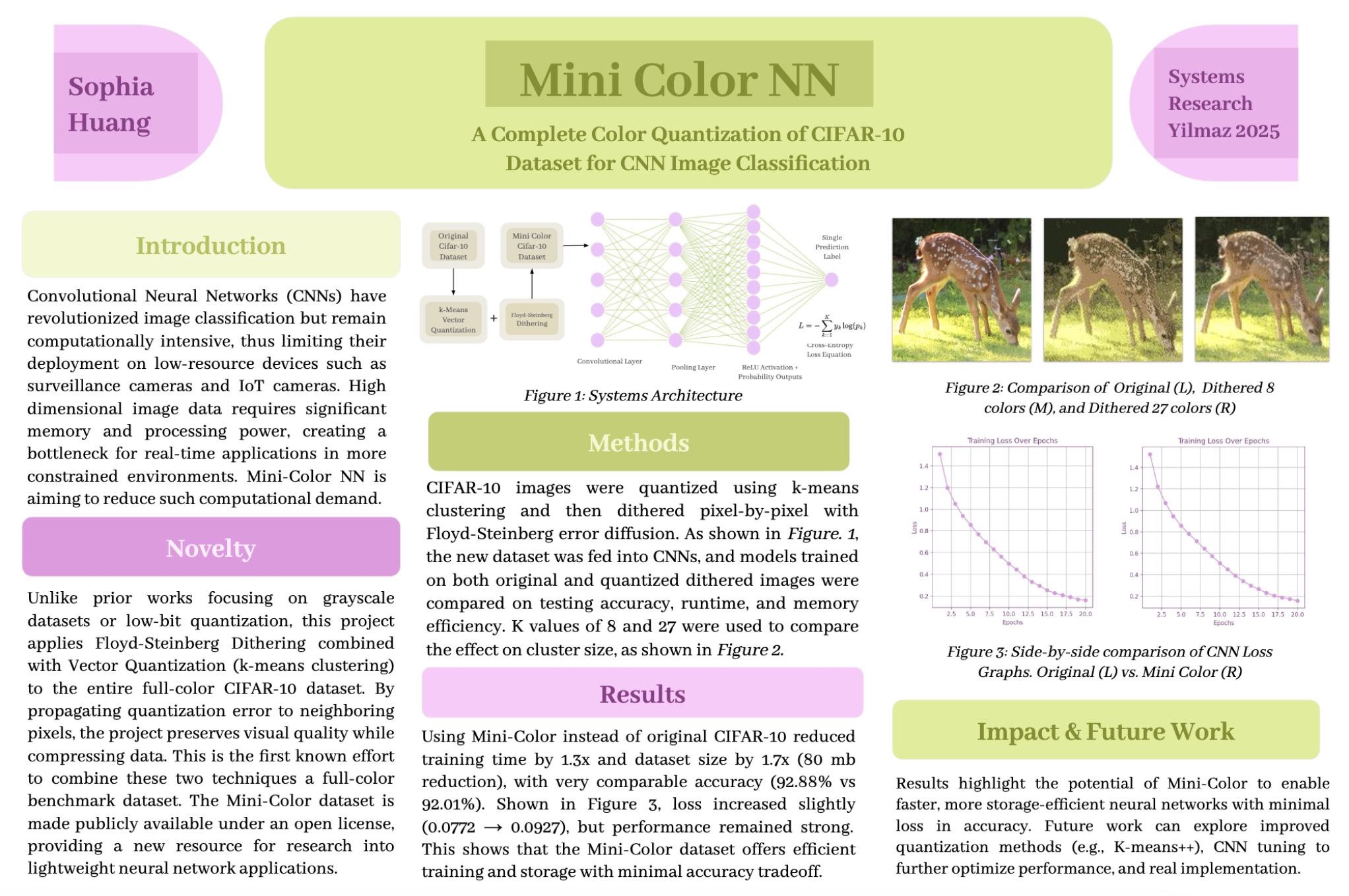 Convolutional Neural Networks (CNNs) are highly effective for image classification but often require significant computational resources, making them difficult to deploy on low-power devices. This project introduces Mini Color NN, a novel approach that combines k-means vector quantization and Floyd-Steinberg dithering to reduce the color complexity of images in the CIFAR-10 dataset while preserving critical visual information. The resulting Mini Color CIFAR-10 dataset reduces storage requirements by 1.7× and accelerates training time by 1.3×, with only a minor drop in classification accuracy (from 92.88% to 92.01%). These results demonstrate that significant computational efficiency can be achieved without compromising CNN performance, supporting broader deployment of deep learning models in edge computing and resource-constrained environments. This work contributes a publicly available, lightweight dataset and offers a practical preprocessing strategy for efficient image-based machine learning.
