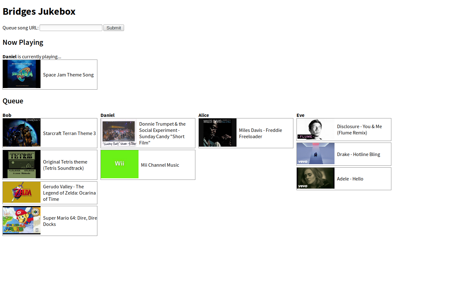 BJukebox is a web interface for contributing songs to a live playlist. Songs can come from Youtube, Soundcloud, or any website the youtube-dl program supports.